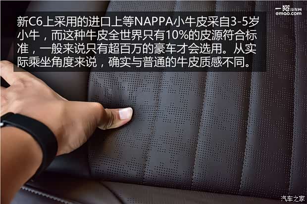 就拿这辆车最引以为傲的车内覆盖材料——小牛皮来说说吧。据了解,全新C6上的小牛皮覆盖材料全部都是从国外进口的高档货,而且是完全加工好之后才运进国内。这些小牛的年龄均在3-5岁之间,并且只选用头层牛皮来制作这些材料,目前世界上符合这个标准的皮源不到10%。在经过400多到工序的处理之后,再由人工将这些牛皮缝好并装车,所以最终这些皮质的触感可以用两个词来形容:无与伦比的细腻和柔软。而这种感觉(尤其是那种细腻感),我只在百万级别的豪华车中感受到过。