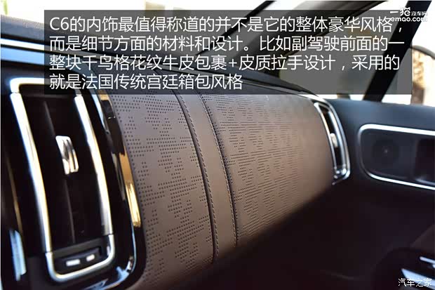 除了材料之外,法国经典的宫廷箱包拉手设计和以千鸟格为灵感设计的打孔花纹也是提升C6车内质感的点睛之笔。而这些独特的,带有国家特色和历史文化气息的设计,能让置身车内的乘客有不一样的豪华感受。