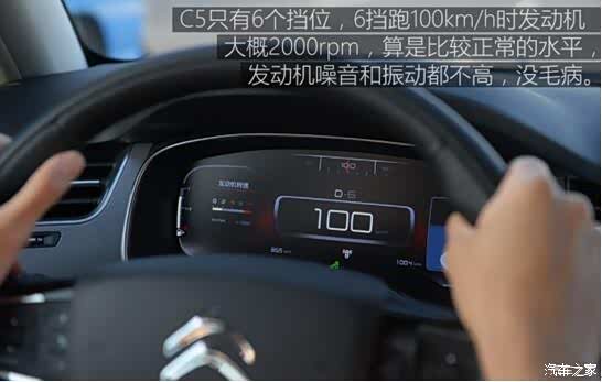 虽然C5的变速箱还是只有6个挡位,但6挡跑着100km/h的时候发动机转速大概2000rpm,算是比较正常的水平,发动机噪音和振动都不高,没毛病。如果想加速的话,轻踩油门至三分之一深度,车辆会很淡定地维持在6挡,不过实际加速表现却也还行。