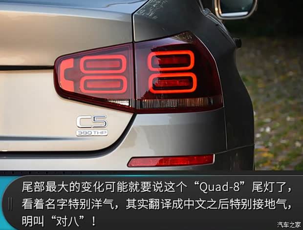 尾部同样沿用了现款车型的整体造型,但在细节上进行了全新设计,其中最明显的就要数尾灯的变化了,雪铁龙官方将这款尾灯命名为“Quad-8”,内部采用116颗LED光源,夜间点亮效果十分出色,辨识度相当的高。