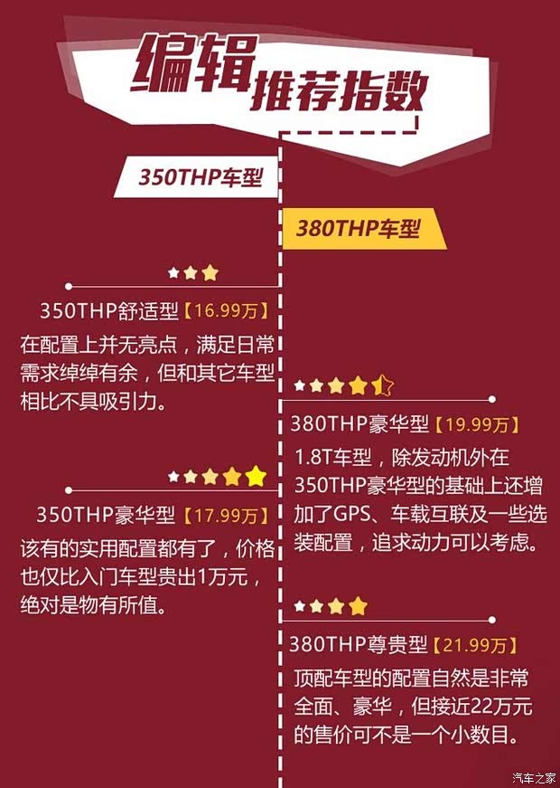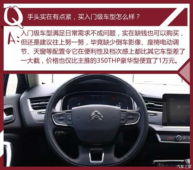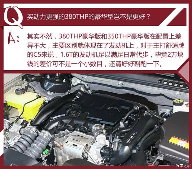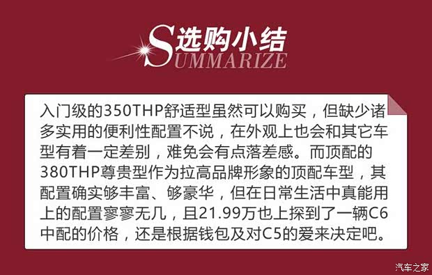 和老款一样,此次的第三代C5仍然延续了1.6T/1.8T两种动力总成,并共计四款车型的配置,虽然选择不多,但足以让不同情况、不同需求的消费者都能找到适合自己的车型。作为一款强调舒适性的中高级轿车,350THP豪华型显然是最为值得入手的一款,而其余三款车型也大可根据自身的实际情况来选择购买。