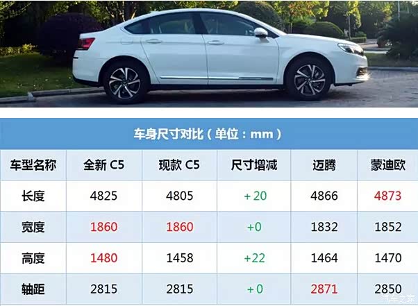 全新C5的轴距(2815mm)和车身宽度(1860mm)与现款保持一致,只是长和高分别增加了20mm、22mm,虽然与竞品相比没什么优势,不过坐在后排时差距并不明显。唯 一不足的是全新C5全系都没有配备全景天窗,多耽误看星星撩妹啊。