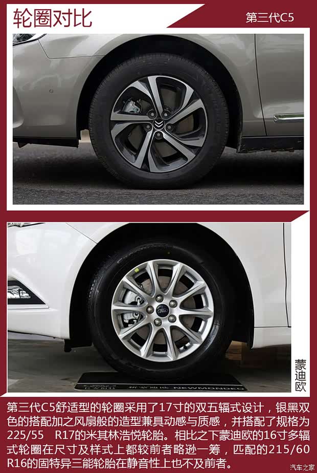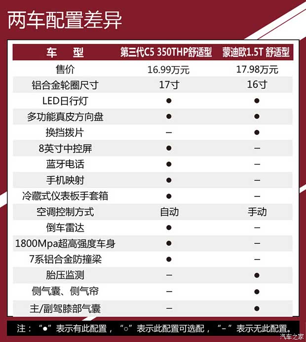两车的入门级车型都有着非常齐全的配置,如日行灯、多功能真皮方向盘等均有配备。但第三代C5凭借着的16寸轮圈 米其林浩悦轮胎的组合拥有更强的抓地力及静音性,且双模式自动空调及定速巡航等配置也是Meng di o所不具备的,8英寸中控屏的搭载更是进一步放大了Meng di o的劣势。而安全配置方面,可以看出两车均是非常重视的,只不过第三代C5采用了高强度材料来提升车身强度,Meng di o则是在安全气囊上大做文章,但就成本而言,前者显然要高于后者。总的来说,第三代C5 350THP舒适型在售价比Meng di o的EcoBoost 180舒适型便宜9900元的情况下,却拥有更为全面的舒适性及科技配置,以及更高成本的安全配置。