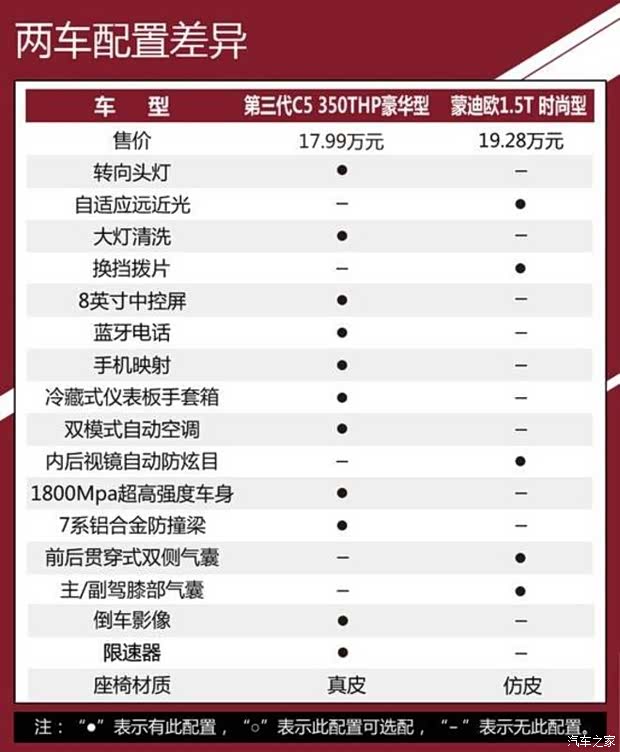第三代C5 350THP豪华型和Meng di oEcoBoost 180时尚型均较入门级车型增加了不少实用配置,如电动天窗、座椅电动调节等。其中第三代C5不仅装备了转向头灯及大灯清洗功能,并追加了极为实用的倒车影像及限速功能,且座椅也升级成为真皮材质,而17.99万元的售价更是比Meng di o的19.28万元便宜了1.29万元,相比入门级车型的价格优势进一步放大。而Meng di o则依然没有搭载中控屏,蓝牙、倒车影像等功能更是无从谈起,且在座椅材质上也要略逊一筹,虽然新增的自适应远近光及内后视镜防炫目功能,但和前者的亮点配置相比就显得有些微不足道了。