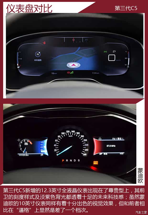 在第三代C5的顶配车型与Meng di o的EcoBoost 200豪华型的比拼中,我们能看到两款车都已装备了丰富的越级配置,然而第三代C5则又一次战胜了Meng di o。无论是从舒适性的座椅加热、按摩、Hi-Fi高保真音响,还是从12.3英寸全液晶仪表、车载互联系统来说,都让它拥有了比对手更为出色的舒适性及更高的“逼格”,而360°全景影像、车道偏离预警及盲点监测等配置也令各种潜在危险无处遁形。虽然Meng di o搭载的自适应远近光、转向辅助灯及方向盘加热灯功能也颇具亮点,但从车型售价和配置的丰富程度上来看确实是不如前者。