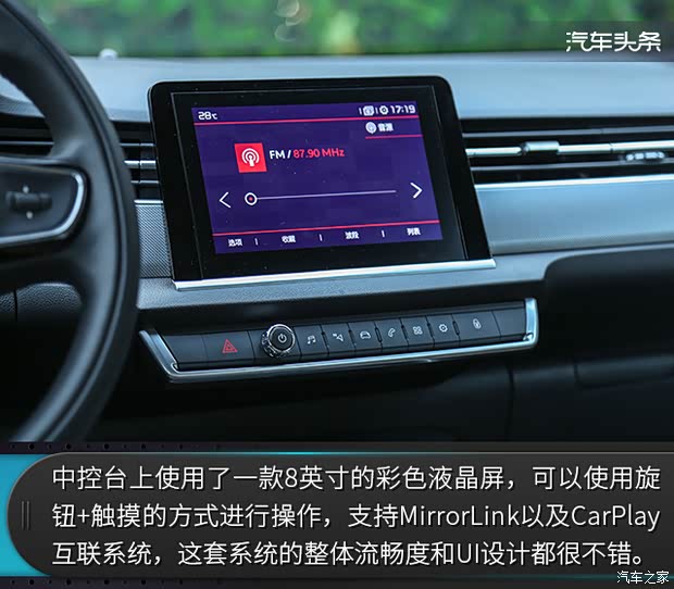 中控台上使用了一款8英寸的彩色液晶屏,可以使用旋钮 触摸的方式进行操作,支持MirrorLink以及CarPlay互联系统,这套系统的整体流畅度和UI设计都很不错,使用一段时间之后会发现这套系统相当的顺手,值得一提的是内部导航由高德提供,可以联网显示实时路况,并且可以与手机上的高德地图进行互联。