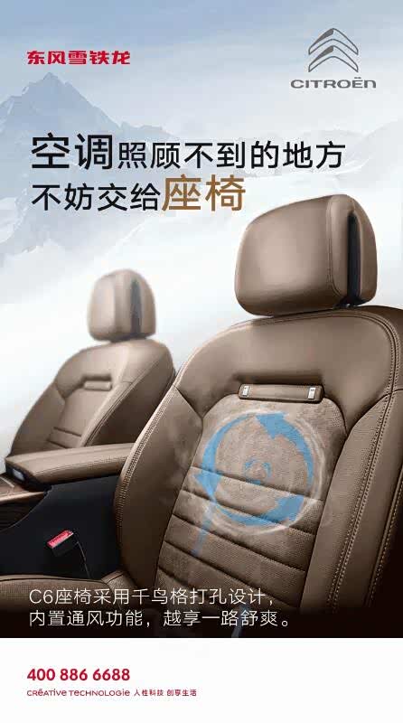 C6内置的座椅通风功能,很好地终结了座椅的闷热——通过内置的风扇向座椅内注入空气,空气从座椅表面的小孔流出,从而达到循环通风的效果,即便长时间乘坐,身体与座椅的接触面也会干爽舒适。C6座椅还采用了象征着法式经典的千鸟格打孔设计,并集合了按摩、记忆等人性化的功能。