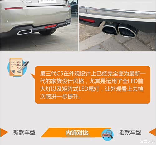 东风雪铁龙旗下中级车型C5迎来了全新换代,历经三代进化,新款C5在外观设计、功能配置方面都进行了大刀阔斧的革新,但最终售价相比老款却降低了。从而让产品的性价比得到进一步提升。而C5的老款车型无论从外观设计还是空间动力水平都无法和当前竞品形成有效抗争,那么新款C5的到来让雪铁龙在中级车市场又重新释放了战斗力。那么新款C5相对于老款有哪些改变呢?