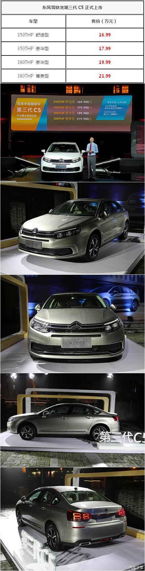 2017年6月23日,东风雪铁龙第三代C5正式上市,售价16.99--21.99万元,新车在外观和内饰上均进行了较大幅度的升级,动力方面继续搭载1.6T/1.8T发动机和6速手自一体变速箱。另外,此次东风雪铁龙还为广大购车用户准备了“驾享升级上市礼遇”——送全额购置税,最高金额超1.7万元;送3年5次保养,售价约0.3万元,实际购车成本在15万到20万左右,给广大用户带来了更超值的驾享体验。新车根据车型配置的不同,具体售价如下: