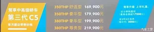 第三代C5将推出四款车型,其中两款搭载1.6T发动机,分别是350THP 舒适型和350THP 豪华型;另外两款搭载的是1.8T发动机,分别是380THP 豪华型和380THP 尊贵型。从市场上消费者购买B级车的款型来看,350THP和380THP的豪华型这两款无疑会是第三代C5的主销车型。