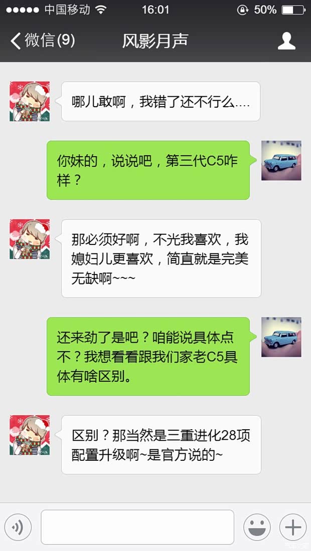 在经过一番了解之后,这位朋友果然又换了一辆第三代C5的顶配车型,虽然刚开始笔者还产生了“他是不是脑子被驴给踢了”的想法,但在看完这款新车的表现以及他给我发过来的聊天记录之后,他会有这样“疯狂”的举动确实也就不难理解了。毕竟第三代C5在保留法系车出色操控及舒适性的情况下,整体变得符合国人的审美与使用习惯,新增的大量配置以及实惠的价格更是令它的“逼格”和性价比得到了飞跃性的提升。别说是一个C5的“真爱党”了,相信就是对任何一个消费者来说都是难以抗拒的。