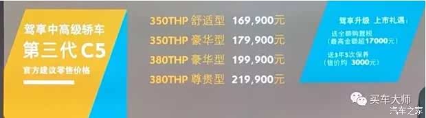 第三代C5将推出四款车型,其中两款搭载1.6T发动机,分别是350THP 舒适型和350THP 豪华型;另外两款搭载的是1.8T发动机,分别是380THP 豪华型和380THP 尊贵型。从市场上消费者购买B级车的款型来看,350THP和380THP的豪华型这两款无疑会是第三代C5的主销车型。