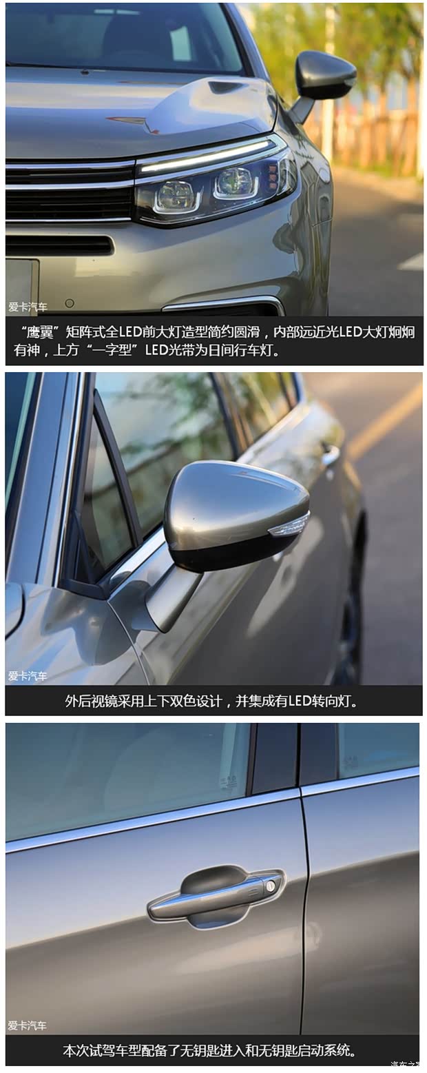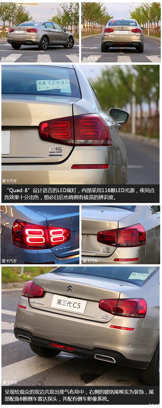 外观的变化主要集中在前后大灯组及细节设计上,我的同事林宇已经在此前发表的实拍文章中对它的外观、内饰、空间等方面进行了详细的介绍,这里仅对第三代C5进行简单的特点介绍。