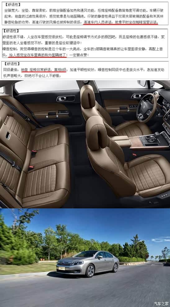 可以看到,车主对雪铁龙C6外观普遍认为大气,多处LED颇受好评,内饰感受则是设计简约而又有格调,还不失科技感,用料、做工高级,豪华。