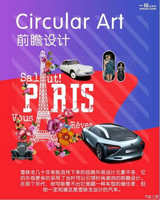 举个例子,巴黎时装周每年都要举办两次,主题都是以设计博取大家的眼球。每年衣服的设计都不尽相同,没有定式可言,但每年都会有那么几款变成引领接下来半年甚至一年风尚的款式。雪铁龙也一样,它的设计更多的是引领当时时代的一种设计潮流。你可能看不出这是哪一台车的继任者,但你一定知道这是雪铁龙所设计的汽车。