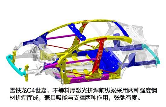 正面碰撞情况比较常见,带来的直接伤害比较大,毕竟发动机在前部,如何吸收能量,并为发动机保留安全空间是一个较大难题。东风雪铁龙C4世嘉,不等料厚激光拼焊前纵梁采用两种强度钢材拼焊而成,兼具吸能与支撑两种作用,张弛有度;蒂森克虏伯公司提供先进焊接技术,既减轻了重量,又保证强度,焊缝也美观平整。