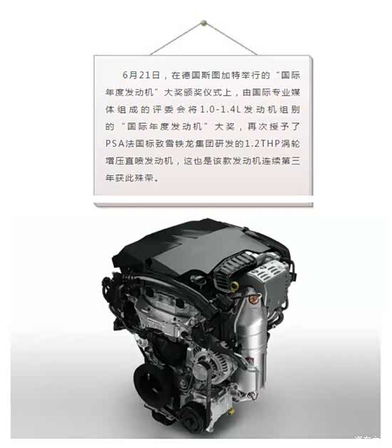 6月21日,在德国斯图加特举行的“国际年度发动机”大奖颁奖仪式上,由国际专业媒体组成的评委会将1.0-1.4L发动机组别的“国际年度发动机”大奖,再次授予了PSA法国雪铁龙集团研发的1.2THP涡轮增压直喷发动机,这也是该款发动机连续第三年获此殊荣。