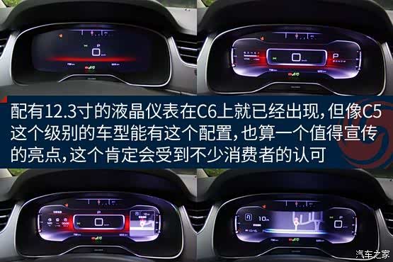 配置方面,全液晶仪表、FCW前方碰撞预警系统、LDW车道偏离预警系统、SAM盲区监测系统等主流中型车上常见的科技配置,在新款C5上也都找得到,达到了这一级别主流车型的平均水平。在空间方面,与现款车型基本保持一致,而在舒适性体验上则更胜一筹。