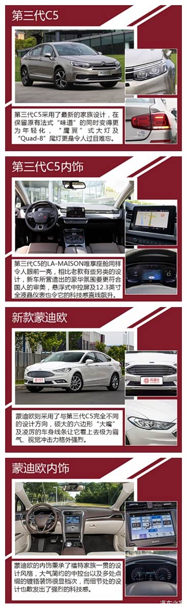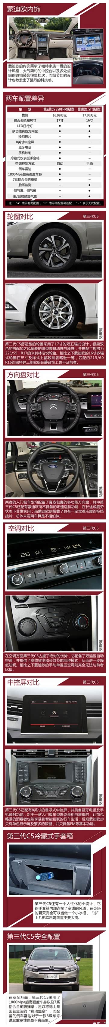 此次的第三代C5共推出了4款车型,售价区间为16.99-21.99万,和老款车型的17.99-23.69万相比可谓是实现了“加量还减价”,和竞争对手蒙迪 欧的17.98-31.98万相比也占据了绝 对的优势。两车同作为主打舒适性的中级轿车,在配置方面的表现自然是重中之重。下面本文就以配置为主对两车进行对比,看看谁的性价比更高。