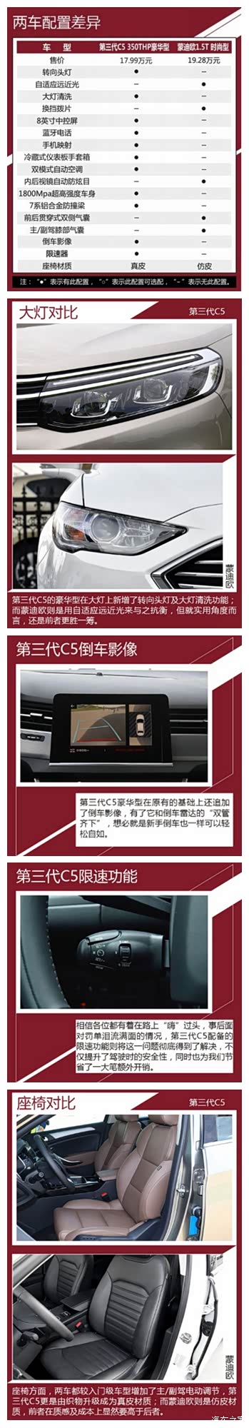 第三代C5 350THP豪华型和蒙迪 欧EcoBoost 180时尚型均较入门级车型增加了不少实用配置,如电动天窗、座椅电动调节等。其中第三代C5不仅装备了转向头灯及大灯清洗功能,并追加了极为实用的倒车影像及限速功能,且座椅也升级成为真皮材质,而17.99万元的售价更是比蒙迪 欧的19.28万元便宜了1.29万元,相比入门级车型的价格优势进一步放大。而蒙迪 欧则依然没有搭载中控屏,蓝牙、倒车影像等功能更是无从谈起,且在座椅材质上也要略逊一筹,虽然新增的自适应远近光及内后视镜防炫目功能,但和前者的亮点配置相比就显得有些微不足道了。