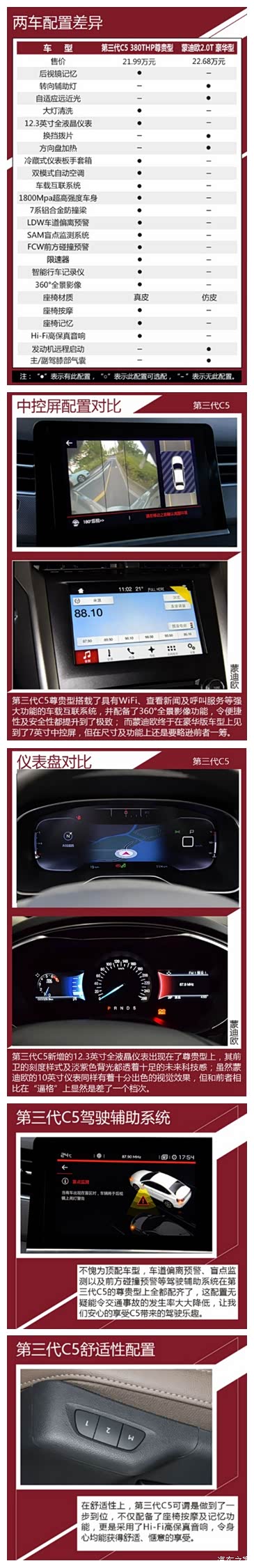 在第三代C5的顶配车型与蒙迪 欧的EcoBoost 200豪华型的比拼中,我们能看到两款车都已装备了丰富的越级配置,然而第三代C5则又一次战胜了蒙迪 欧。无论是从舒适性的座椅加热、按摩、Hi-Fi高保真音响,还是从12.3英寸全液晶仪表、车载互联系统来说,都让它拥有了比对手更为出色的舒适性及更高的“逼格”,而360°全景影像、车道偏离预警及盲点监测等配置也令各种潜在危险无处遁形。虽然蒙迪 欧搭载的自适应远近光、转向辅助灯及方向盘加热灯功能也颇具亮点,但从车型售价和配置的丰富程度上来看确实是不如前者。