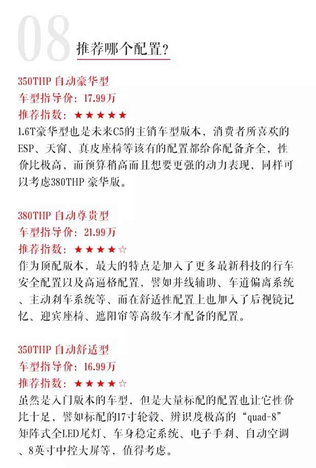 今天所对比的三款车型配置,也是三个车系当中的热销车型!从表格可得知,其实雪铁龙第三代C5无论是在售价以及配置水平方面,都要优胜于两款竞品车型,性价比更高。