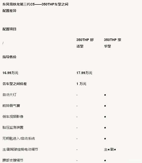 东风雪铁龙第三代C5——350THP(1.6T)车型配置差异情况分析: