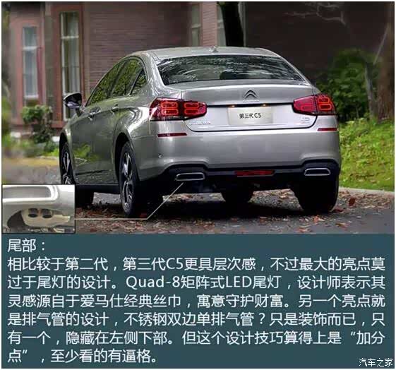 在第三代C5上可以看到不少C6的痕迹,从前脸到轮毂。第三代C5将雪铁龙旗舰车型的“第一把交椅”让给了C5后,更加自由,更注重时尚,走向年轻。