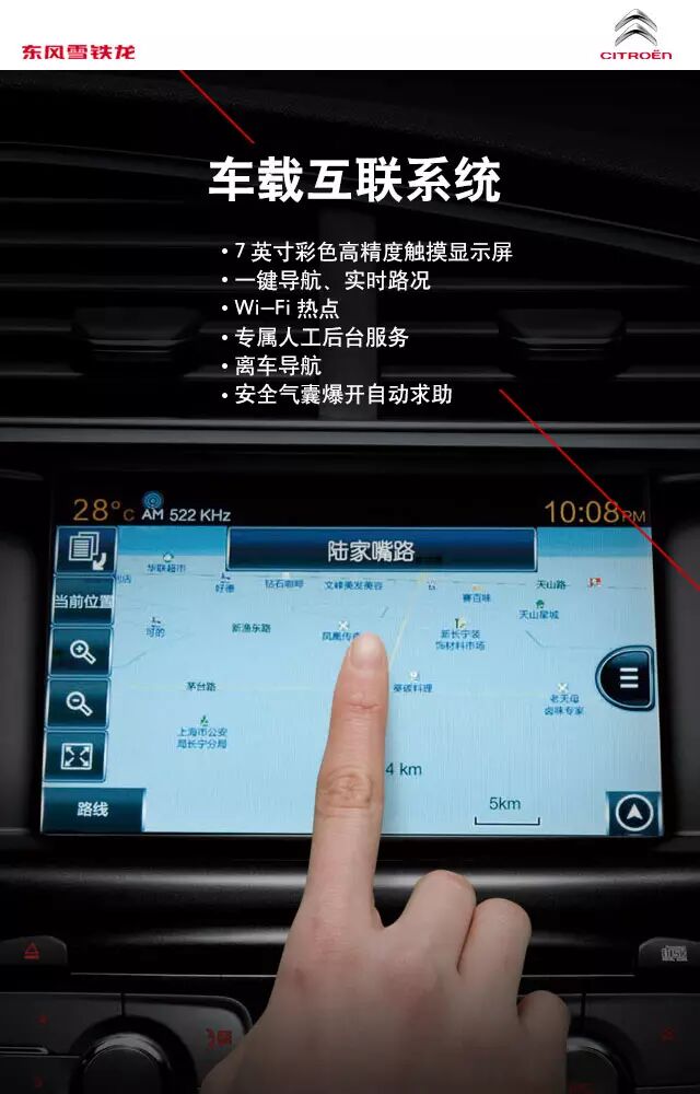 在CITROËNCONNECT 车载互联系统为你打造的移动互联世界里,天气、新闻、股票、城市活动、违章查询……种种精彩,尽在指尖,等你一触即发!