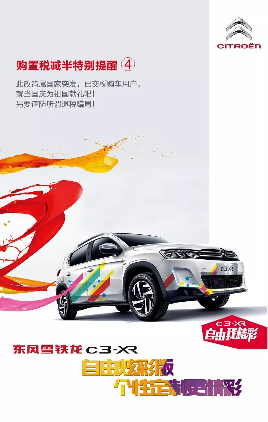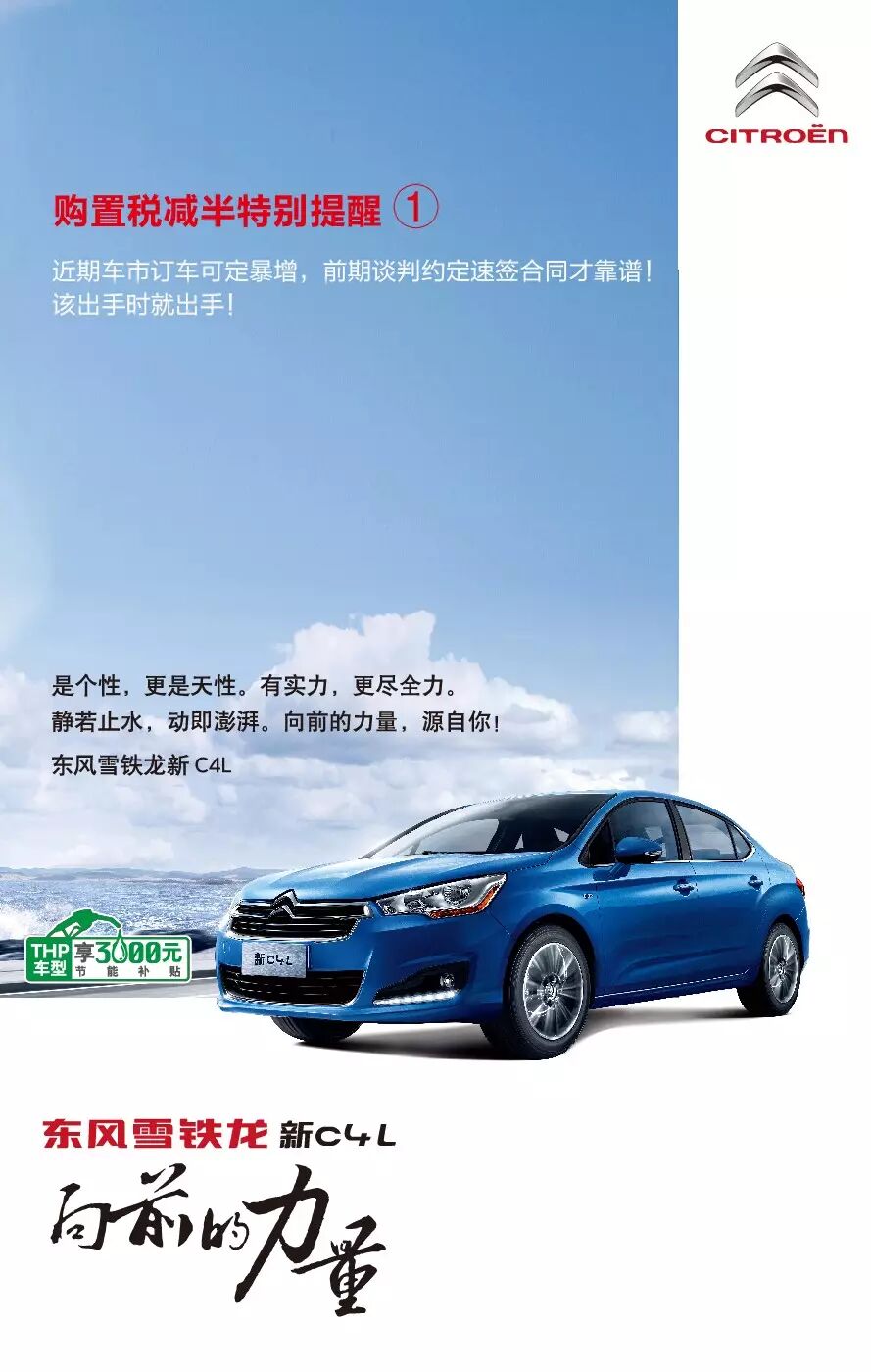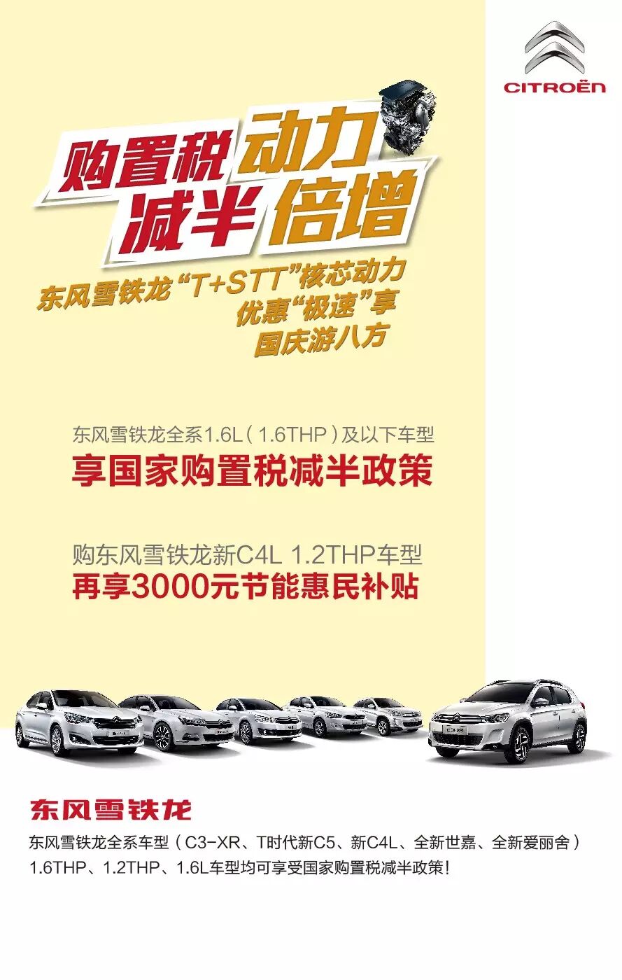 根据这一政策,东风雪铁龙全系车型(C3-XR、T时代新C5、新C4L、全新世嘉、全新爱丽舍)1.6THP、1.2THP、1.6L车型均可享受国家购置税减半政策!国庆长假将至,购车购置税又减半,这样的双重喜事,小伙伴的小心肝可还受得了吗?如果你内心如此强大,那看来我还要加点猛料了。购新C4L1.2THP车型除购置税减半外再享3000元国家节能惠民补贴!光政策的实际优惠力度超过8000元,这下够你心蹦蹦跳跳、灵魂快要出窍了吧?这等好事还不赶紧约上亲朋好友们来个大团购?下次一起自驾游,一群帅哥靓女,齐刷刷的东风雪铁龙,回头率多高,多有面子呀~