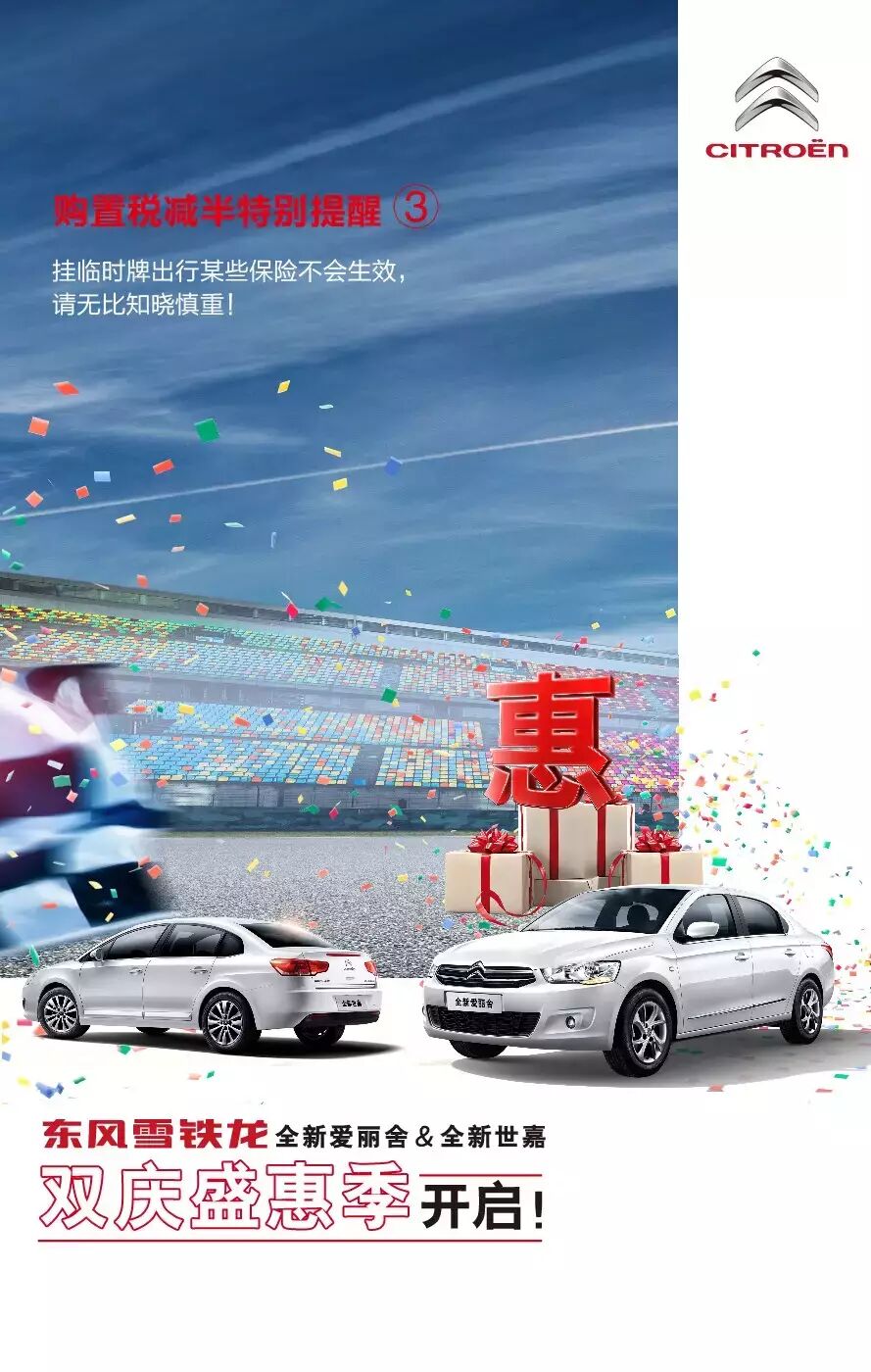 独乐乐不如众乐乐,所以这个重磅喜讯我们真真是迫不及待的想要告诉你:昨日,国务院发布最新消息,自2015年10月1日到2016年12月31日,对购买1.6L及以下排量乘用车实施减半征收车辆购置税的优惠政策。看到这一政策,小编立马看看我们东风雪铁龙能为小伙伴带来什么?!