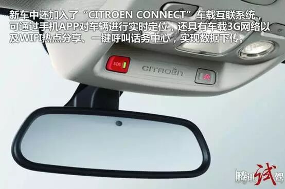 新车中还加入了“CITROEN CONNECT”车载互联系统,可通过手机APP对车辆进行实时定位,还具有车载3G网络以及WIFI热点分享、一键呼叫话务中心,实现数据下传。