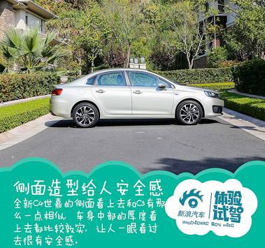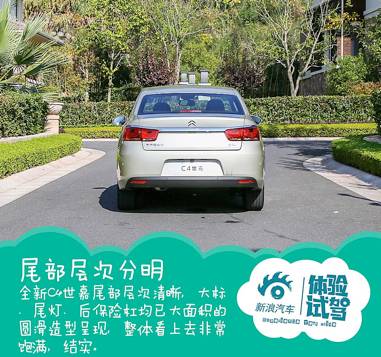 全新C4世嘉的侧面看上去和C5有那么一点相似,车身中部的厚度看上去都比较敦实,虽然不够运动,但是这样的好处显而易见,头部的空间表现应该会不错。C4世嘉的整个车身侧面由车尾到车头以一个斜向下的腰线连接,而为了减少一些视觉上的那种侧面厚厚的笨拙感,在门板上的两根特征线条间形成一个凹陷,让侧面看起来秀气一些。而C柱延伸至尾部可以看出是一个微微上扬的设计,类似一个隐藏的小尾翼,这种设计多在一些运动掀背车上才能见到。在车身尺寸上,此次试驾并没有公布其车身尺寸数据,但是从肉眼来看,其车身尺寸数据绝不会在同级别精品车中落后。而刚刚也提过,侧面看起来给人感觉车内的空间表现应该不错, 而之后的空间测试也验证了这一点。