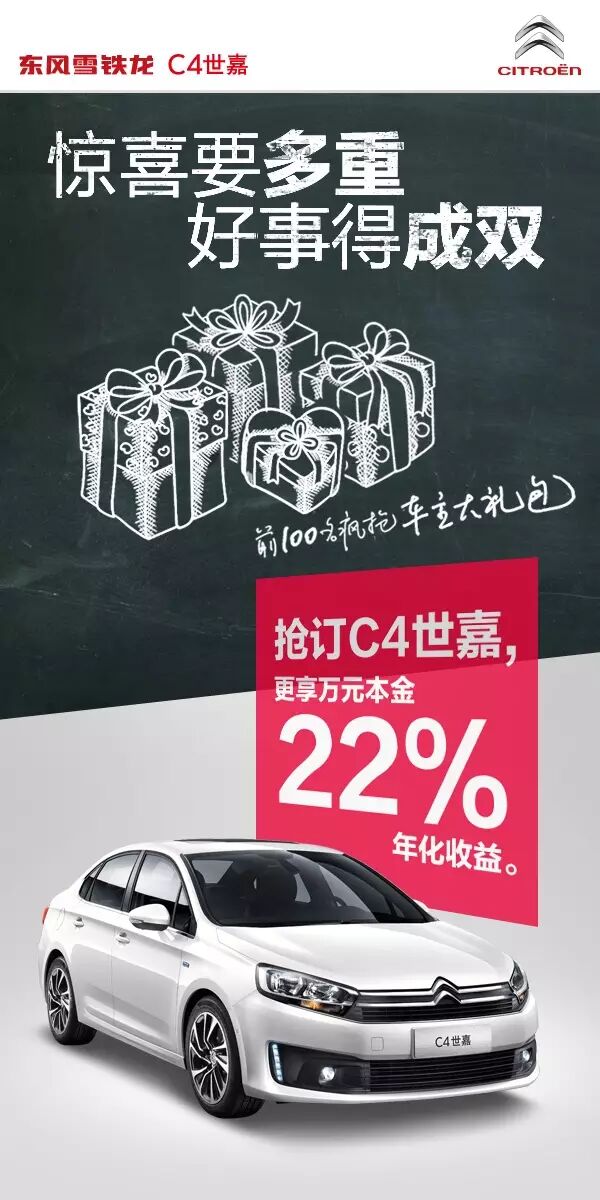 成功预订东风雪铁龙C4世嘉,不仅可以享受比股市更高的收益,还不必承担股市动荡的风险!更重要的,还能享受相继而来的后续大奖。成功预订前100年名用户,后续每周抽10名用户享“首批车主大礼包”。眼光好,不如手快靠谱。