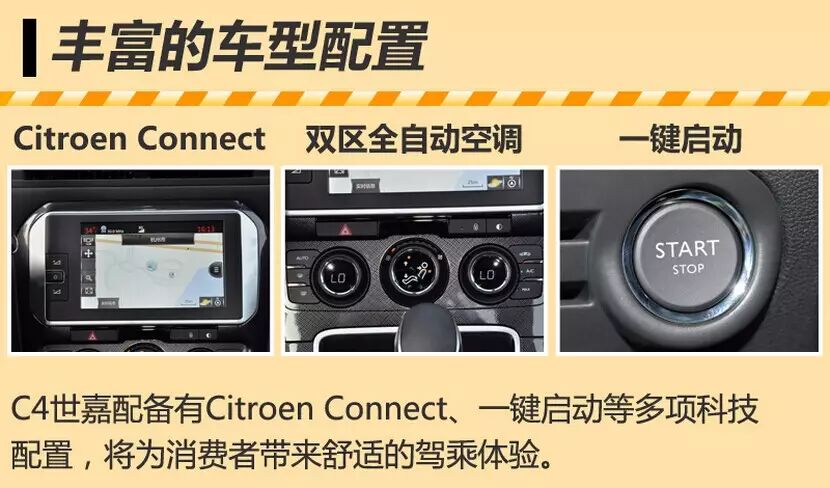 C4世嘉全系标配的7英寸彩色智能多媒体触屏系统,提供高清人性化界面,兼容各种多媒体格式。Citroen Connect车载互联系统不仅具备五大智能模块,还推出个性化的车载电台。此外,双区全自动空调、车内空气净化系统、一键启动/智能免钥匙进入系统等科技配置,将为消费者带来舒适、愉悦的驾乘体验。此外在安全配置方面C4世嘉同样可圈可点,Safeye盲区监测及时到位,为消费者带来全方位的呵护。全系标配的博世第九代电子稳定系统,集成8大主动安全配置,保障行车的稳定和安全。