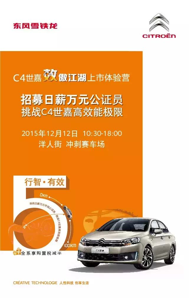 效傲江湖挑战赛——招募日薪万元公证员,挑战C4世嘉高效能极限。所有参与试驾朋友,都有机会成为大奖最终得主,万元奖金等你拿。