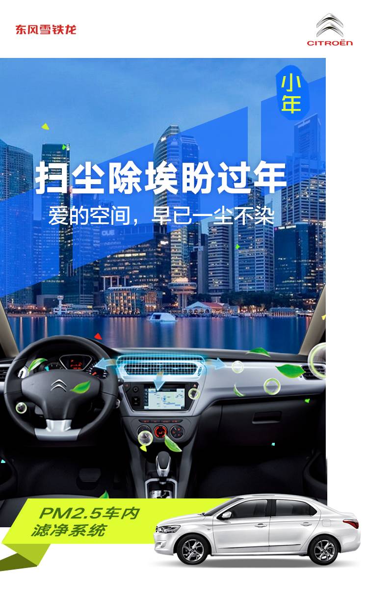过年要扫尘土,生活也要远离尘埃。东风雪铁龙全新爱丽舍2016款特有PM2.5车内滤净系统,有效过滤车内空气,时刻为你带来健康呼吸。和全新爱丽舍2016款在一起,每分钟都是清新好空气。